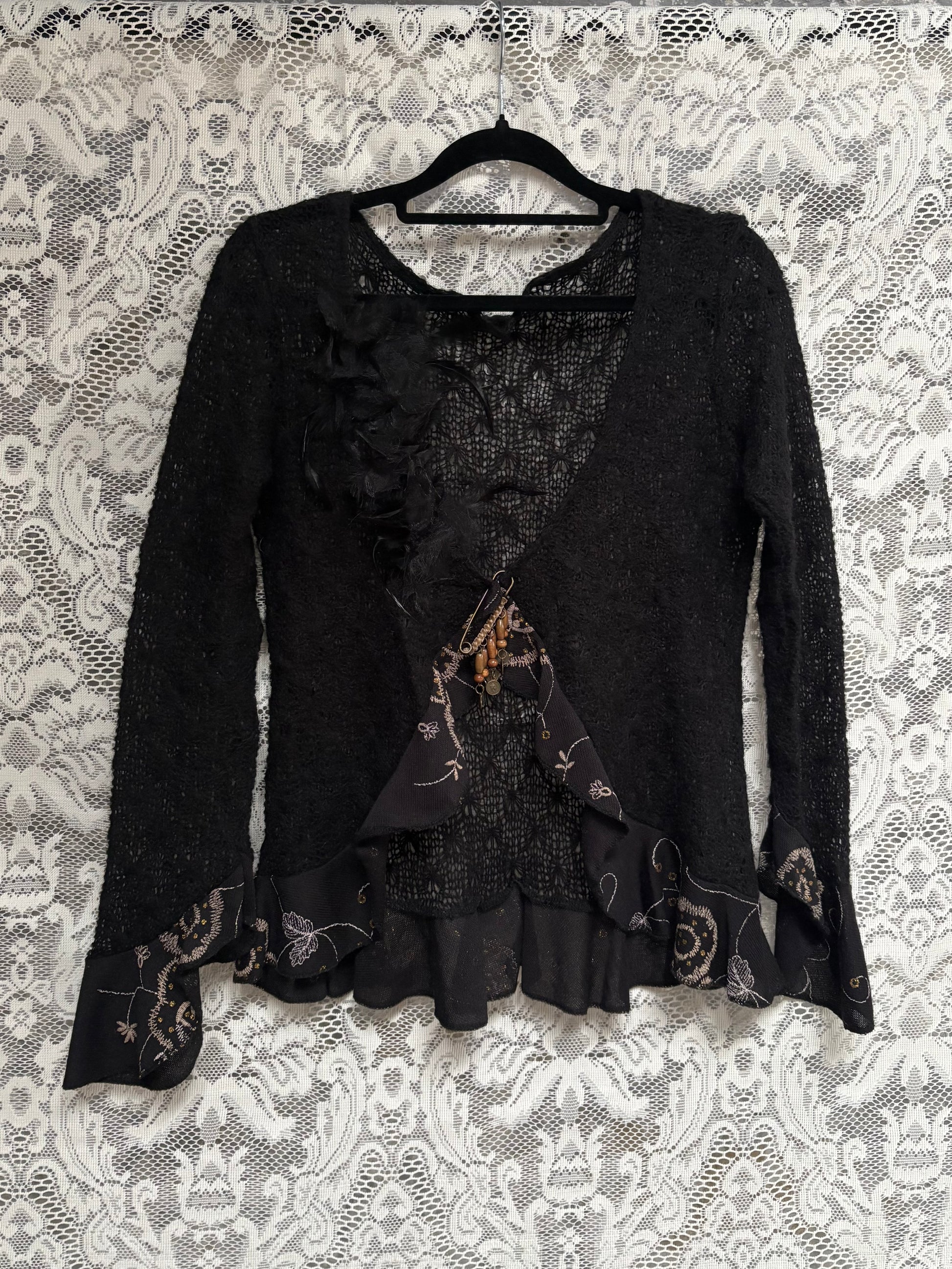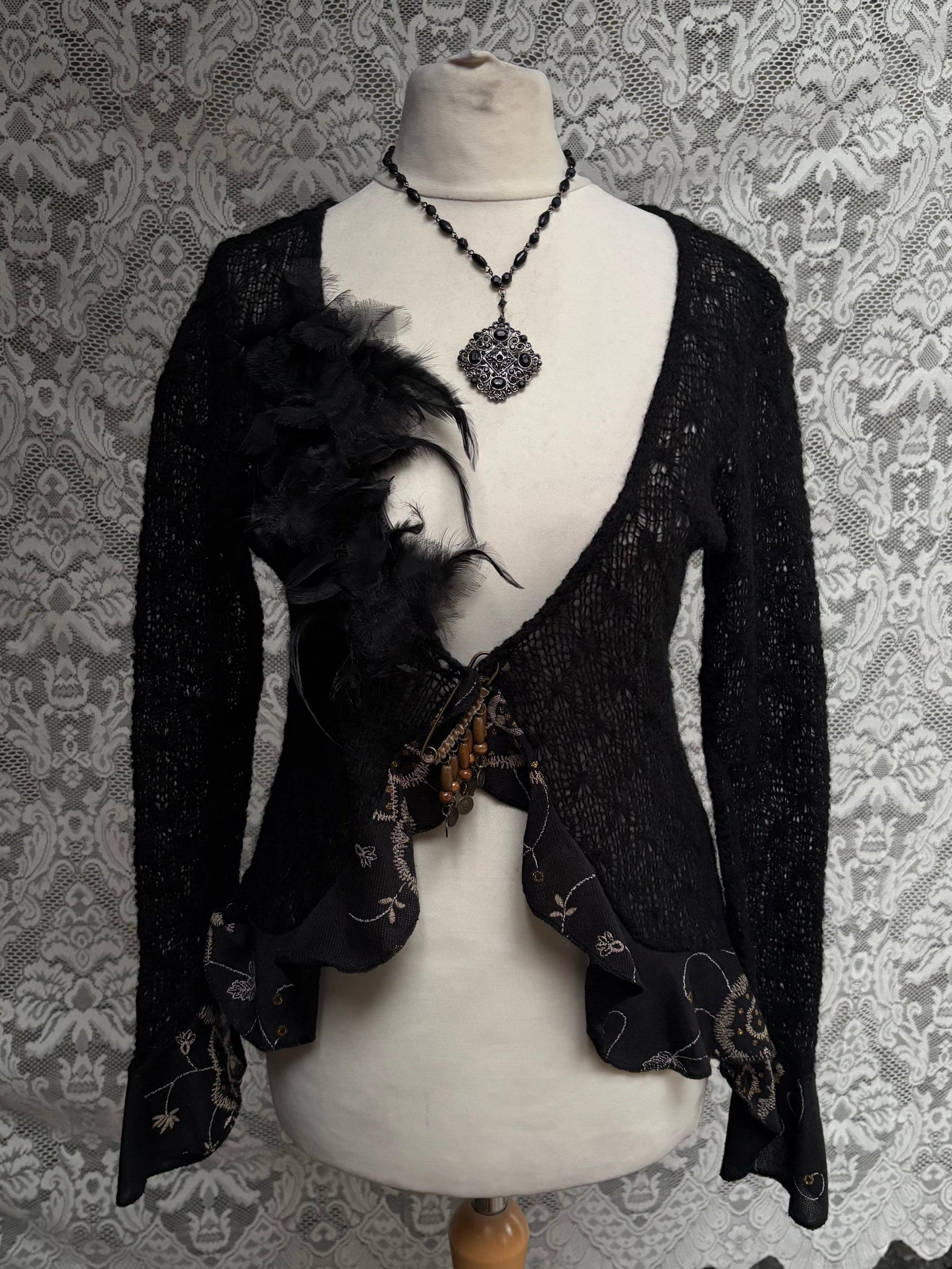 Vintage 1990s Black crochet knitted cardigan with feather embroidery detail