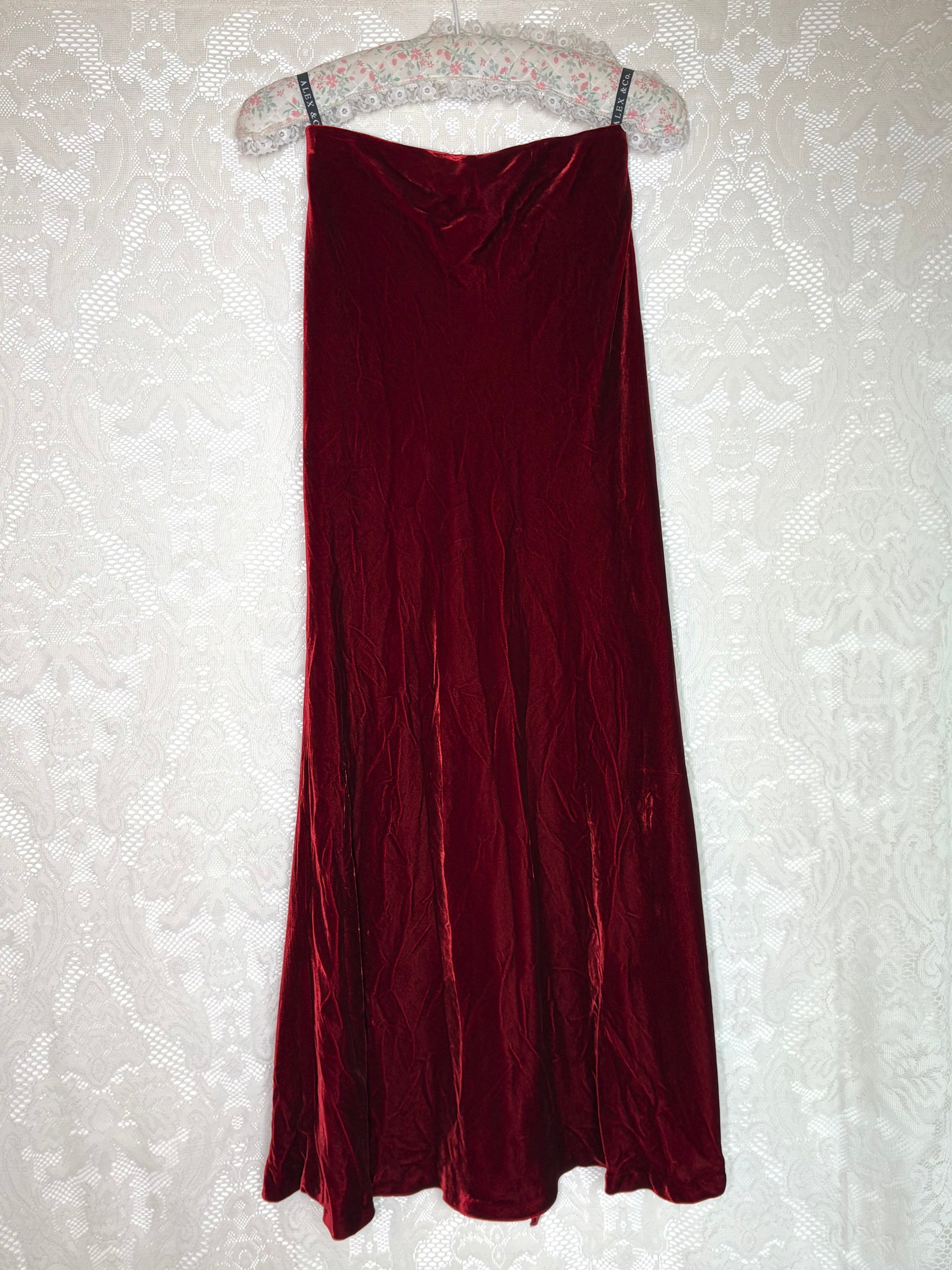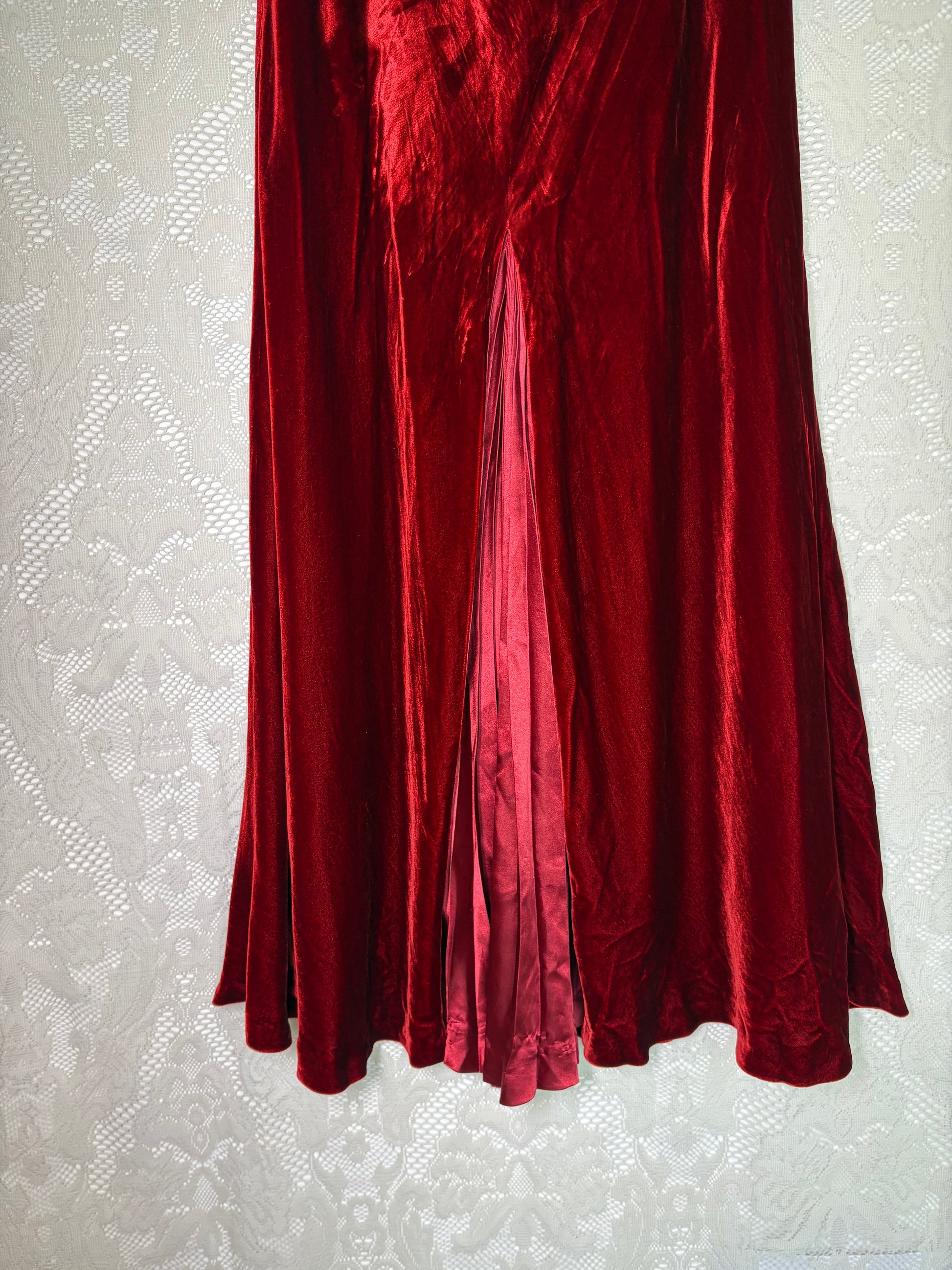 Vintage 1990s red velvet maxi skirt with pleated slit detail